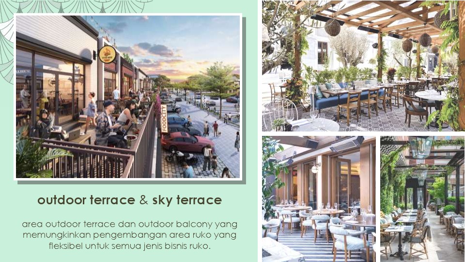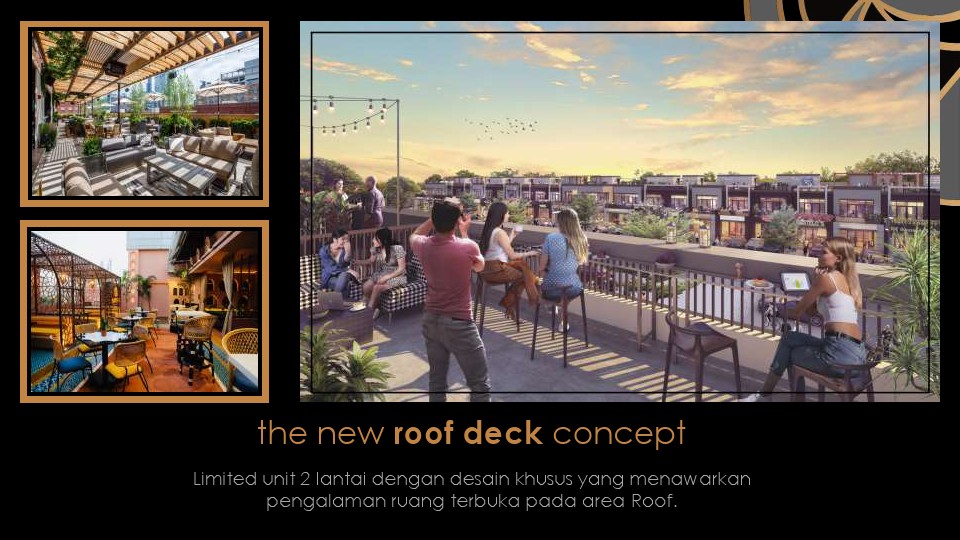 • Konsep ruko sangat menarik, Design Art Deco Concept dan terdapat 3 area outdoor di lantai dasar (Outdoor terrace), di lantai 2 (Sky Terrace) dan di Atap (Roof Deck)